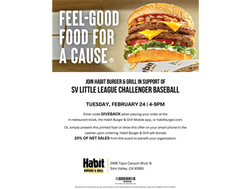 Please join us this Tuesday, February 24, for our 1st restaurant fundraiser of the actual 2026 season. This time we'll be at HABIT (Tapo Canyon location). The fundraiser runs between 4:00 p.m. and 9:00 p.m.